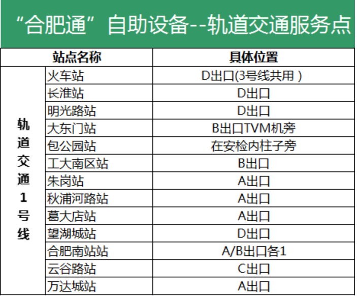 合肥通自助机地铁1号线上位置分布一览表