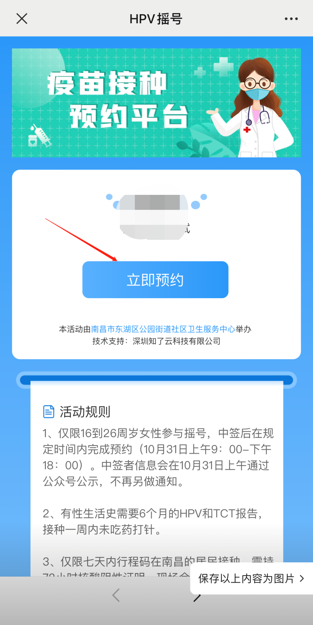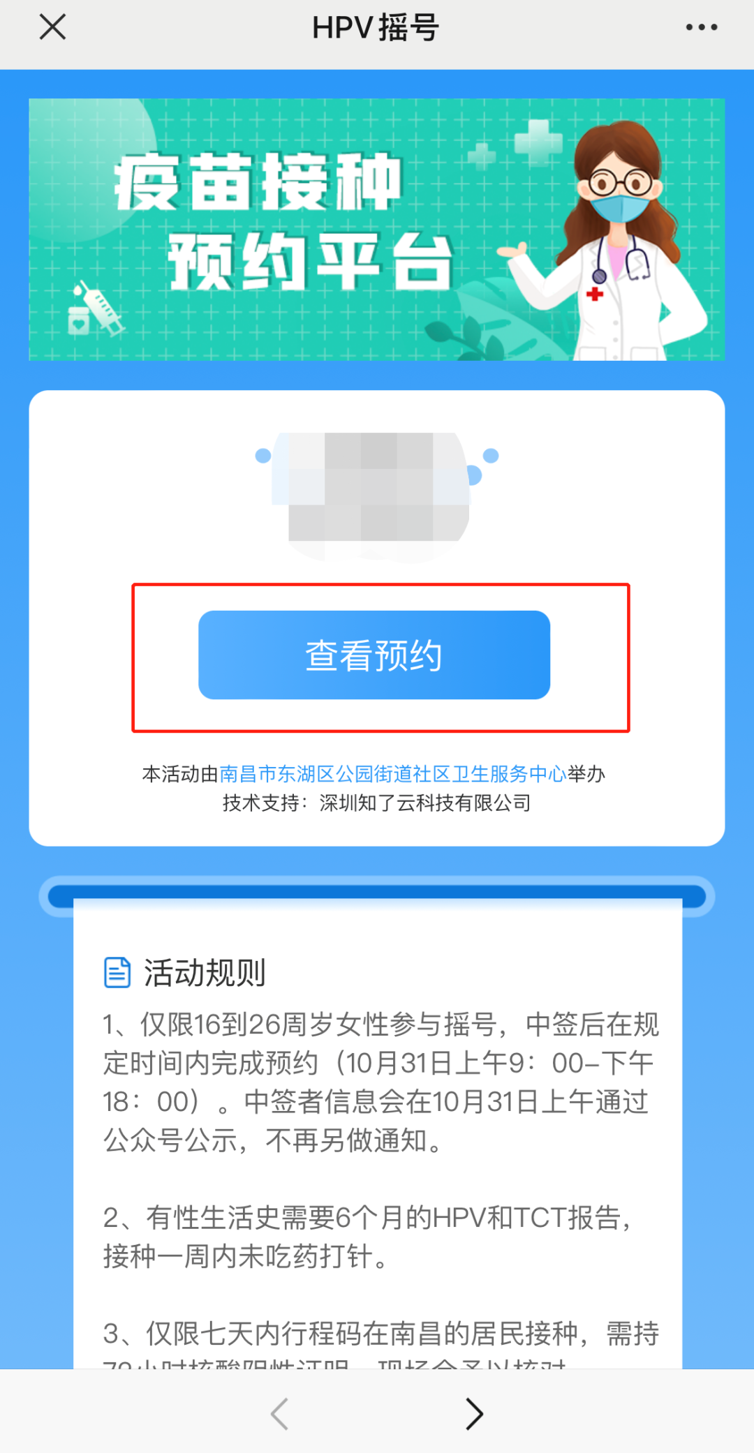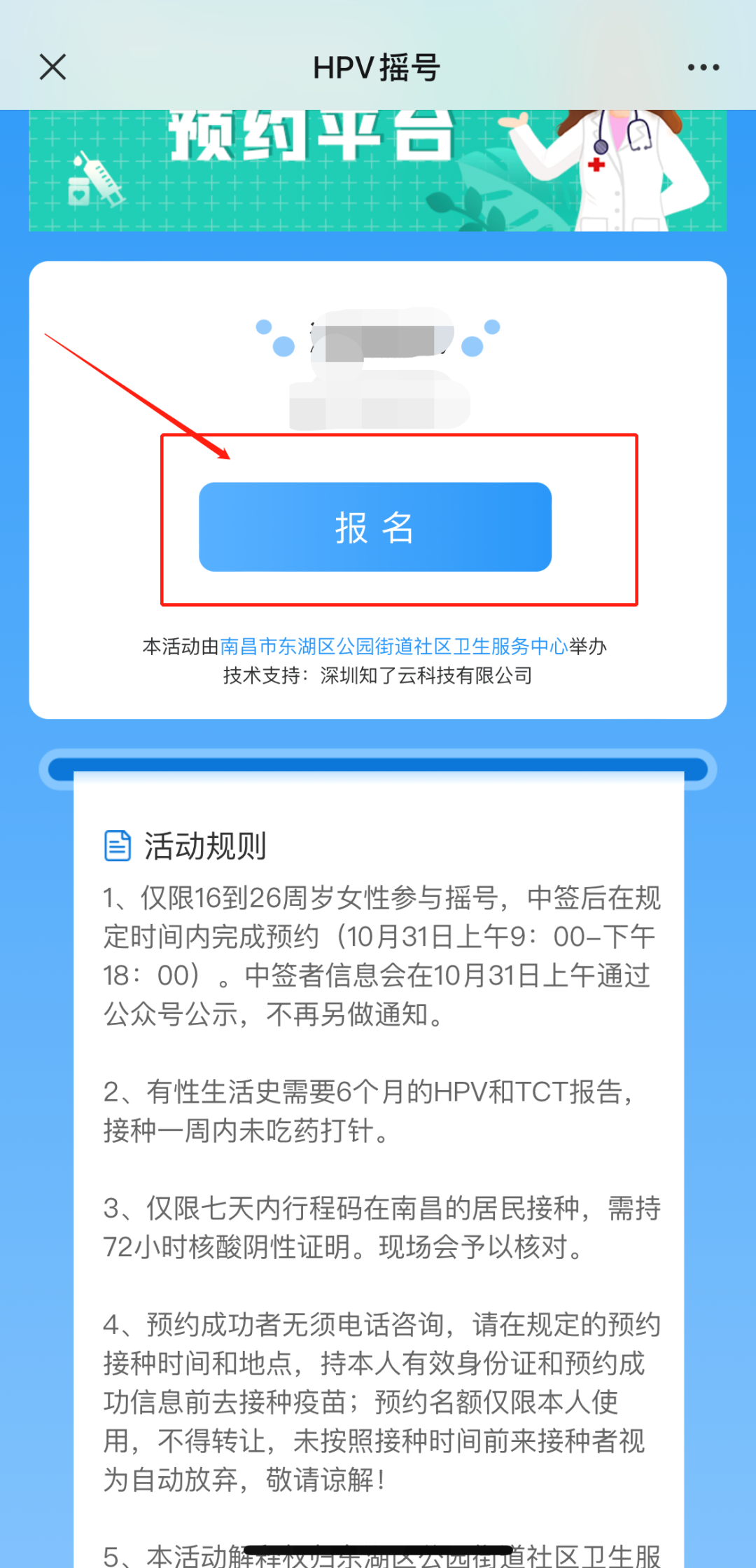 1、仅限16到26周岁女性参与摇号,中签后在规定时间内完成预约(10月31日上午9:00-下午20:00)。