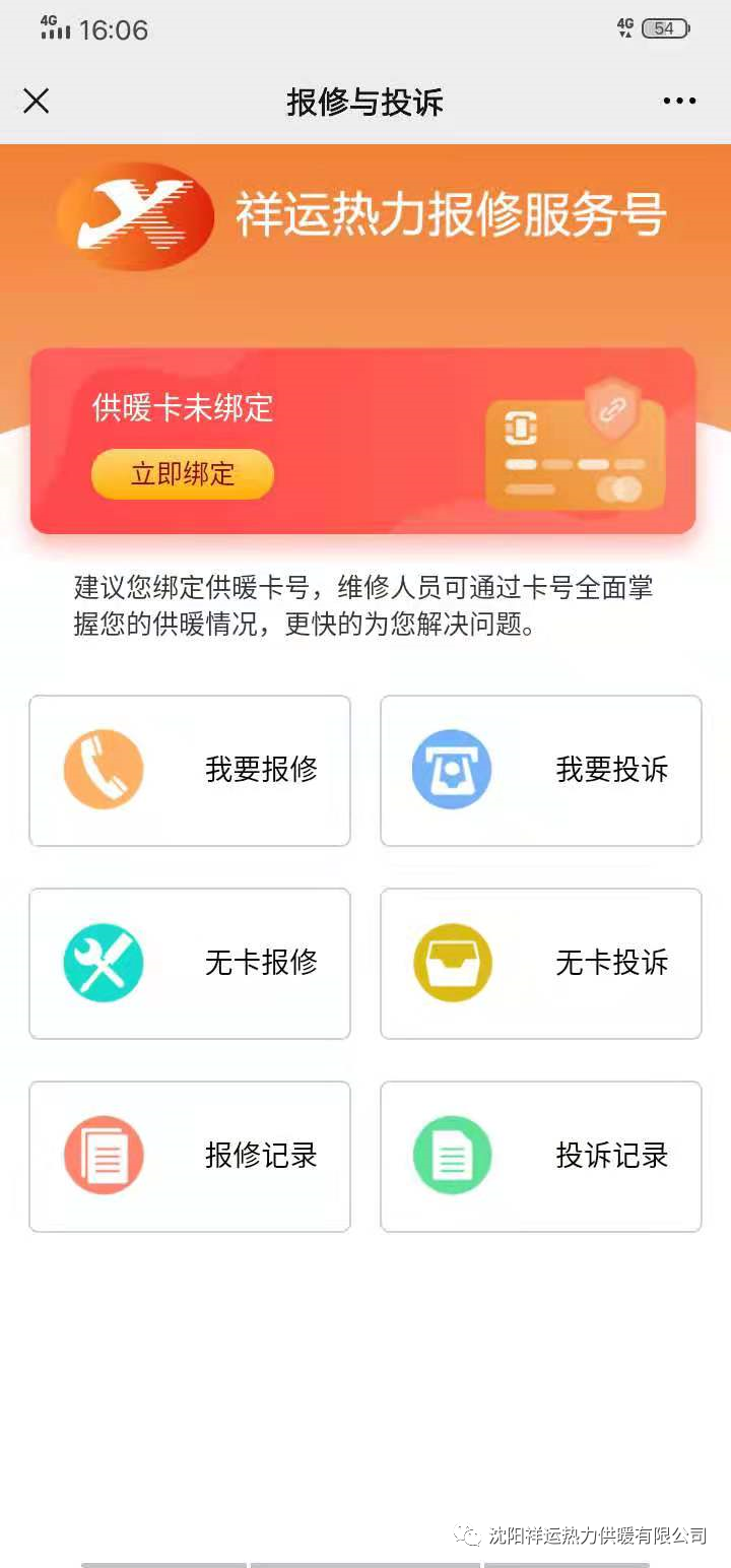 1、进入祥运公众号,点击“缴费报修”-“报修投诉”进入主界面,如果您未绑定过供暖卡该界面将显示“立即绑定”按钮。