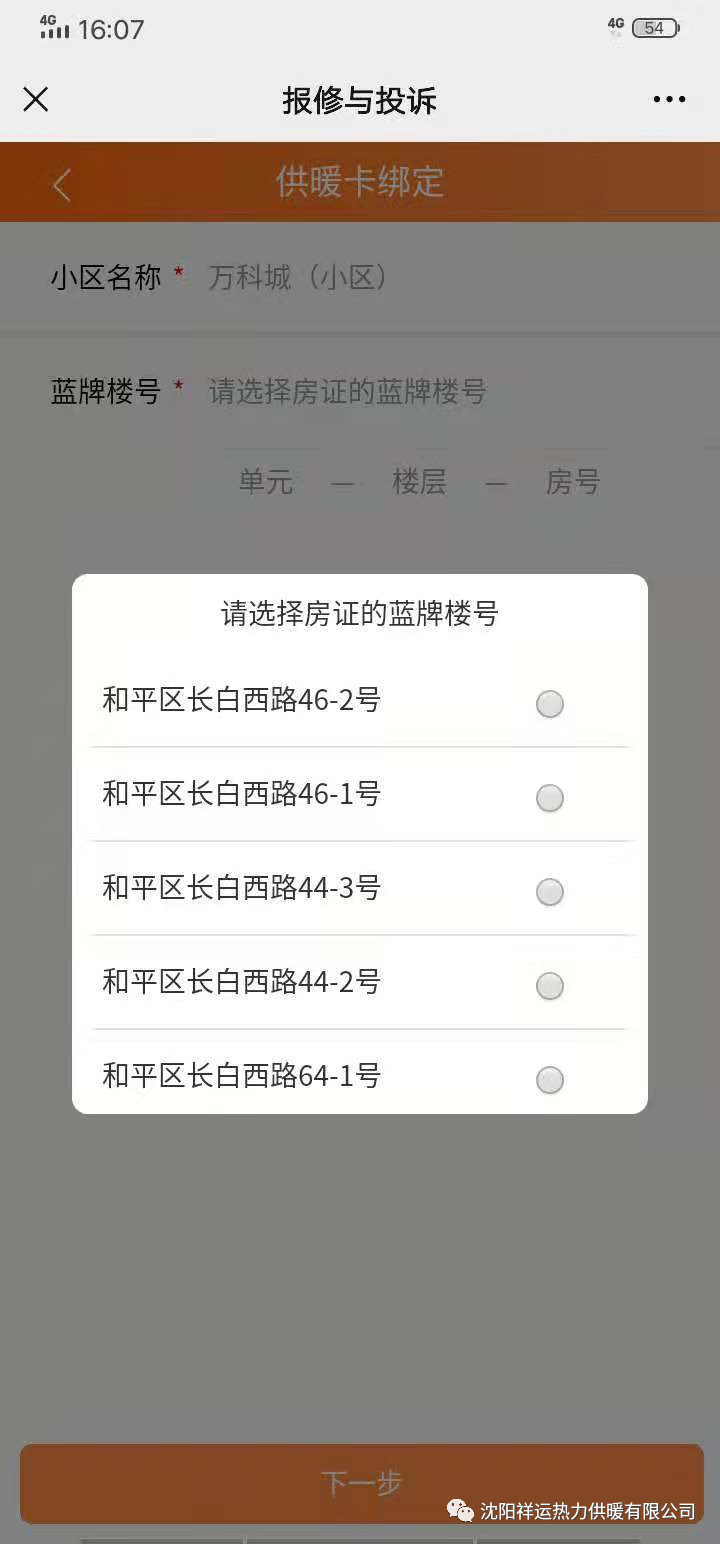 5、选择后请依次点击下方“单元”、“楼层”、“房号”空位输入您的信息,点击“下一步”。