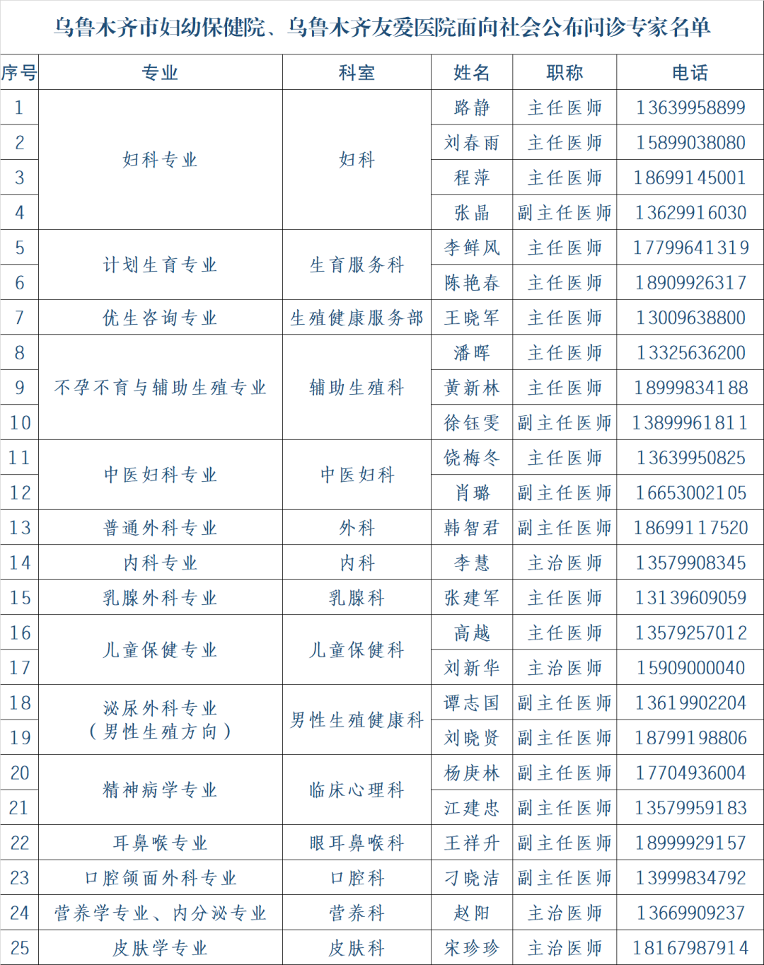 为更好地服务各族患者,方便群众寻医问药,乌鲁木齐市妇幼保健院、乌鲁木齐友爱医院向社会公布25名医疗专家的联系电话。各族群众可通过专家电话联系和咨询问诊用药,妇幼专家将竭尽全力为人民群众解答健康问题。