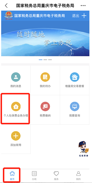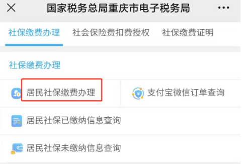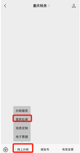 1、点击扫码关注“重庆税务”公众号。关注后点击底部“网上办税”,选择“居民社保”。