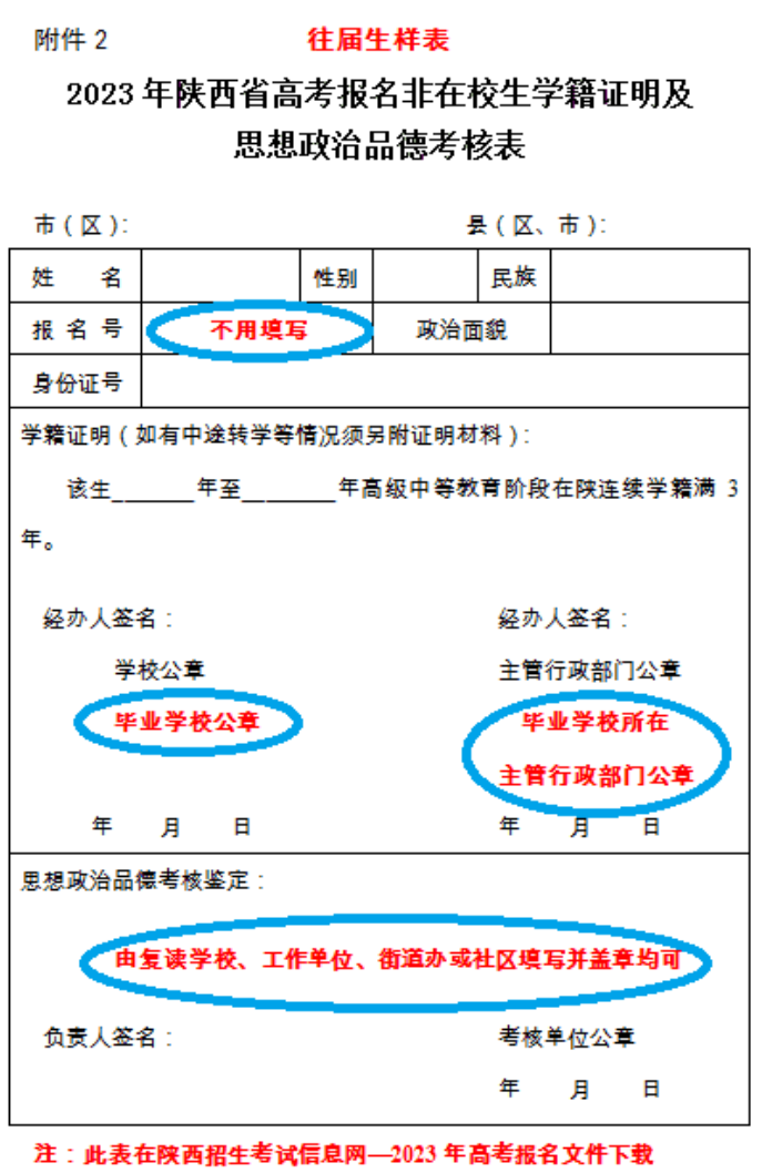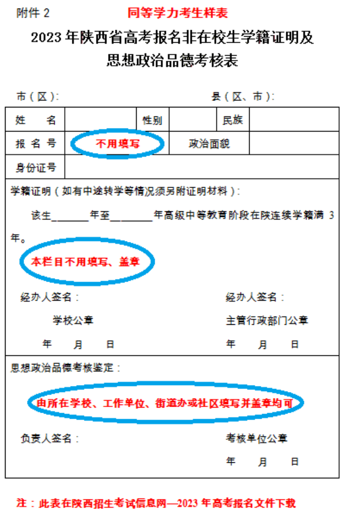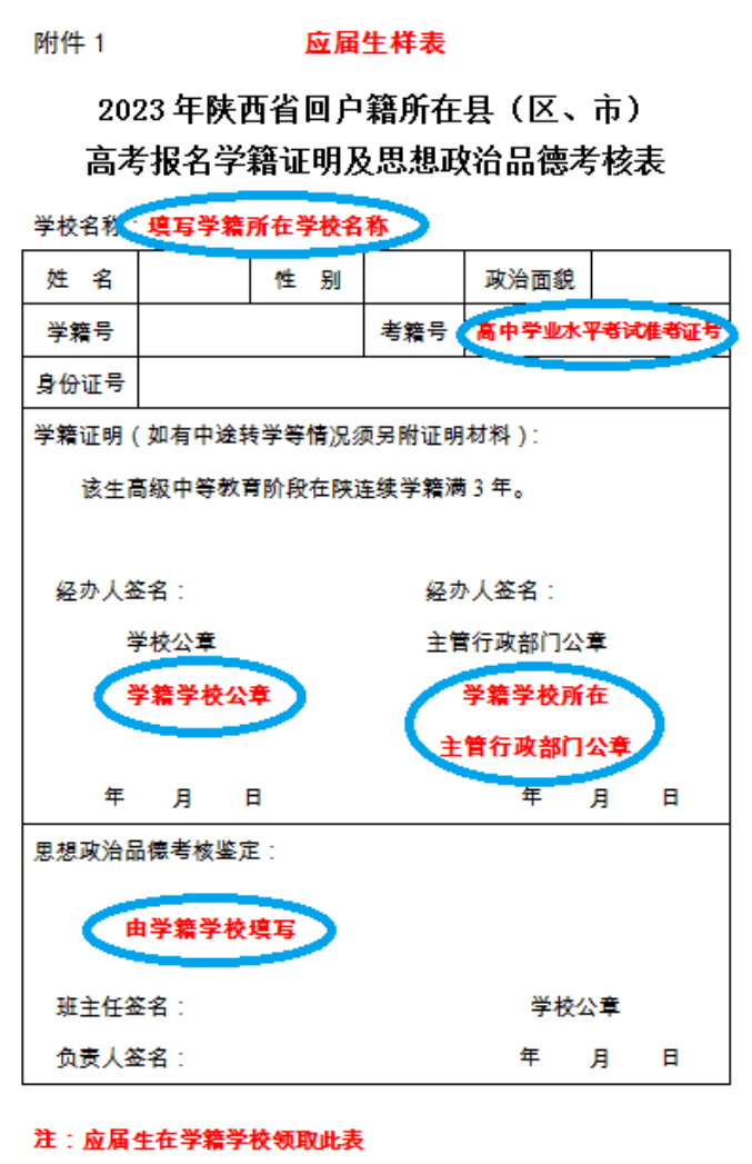 ③《2023年陕西省回户籍所在县(区、市)高考报名学籍证明及思想政治品德考核表》(在学籍学校领取)