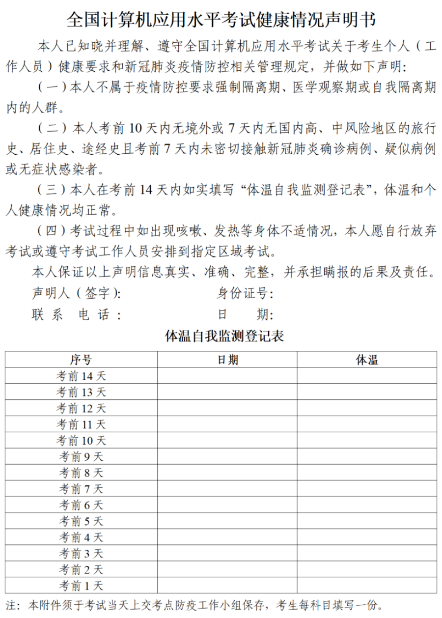 1.所有考生须自觉遵守我省及考点(属地)疫情防控要求,在考试当天出具健康情况声明书、考前48小时内核酸检测阴性证明(电子、纸质版均可)和当日更新的本人“健康码”、“行程卡”绿码,扫描考点场所码并接受体温检测。