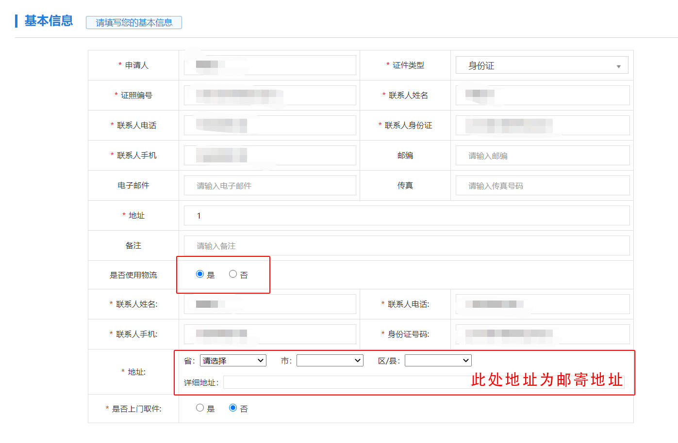 7.填写基本信息和测试信息,是否使用物流一项,选择“是”,并填写邮寄地址