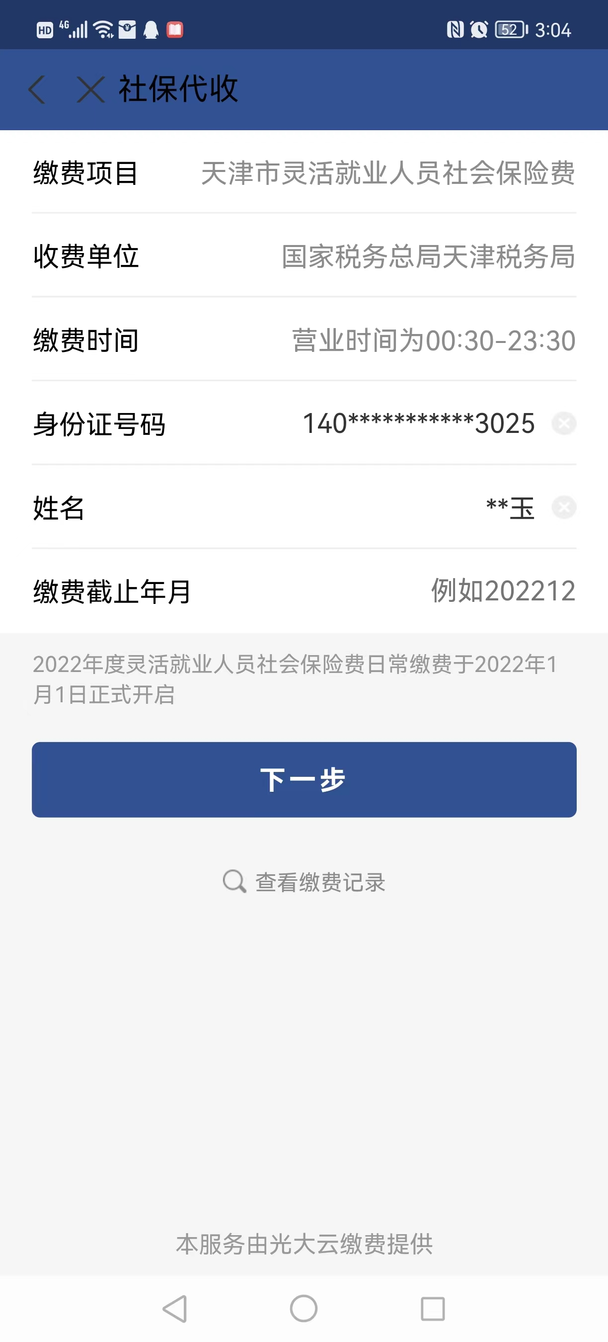 5、输入“身份证件号码”、“姓名”,输入“缴费截止年月”(例如缴纳2022年全年输入“202212”),点击“下一步”;确认基础信息、参保信息是否准确,确认无误后,点击“下一步”。