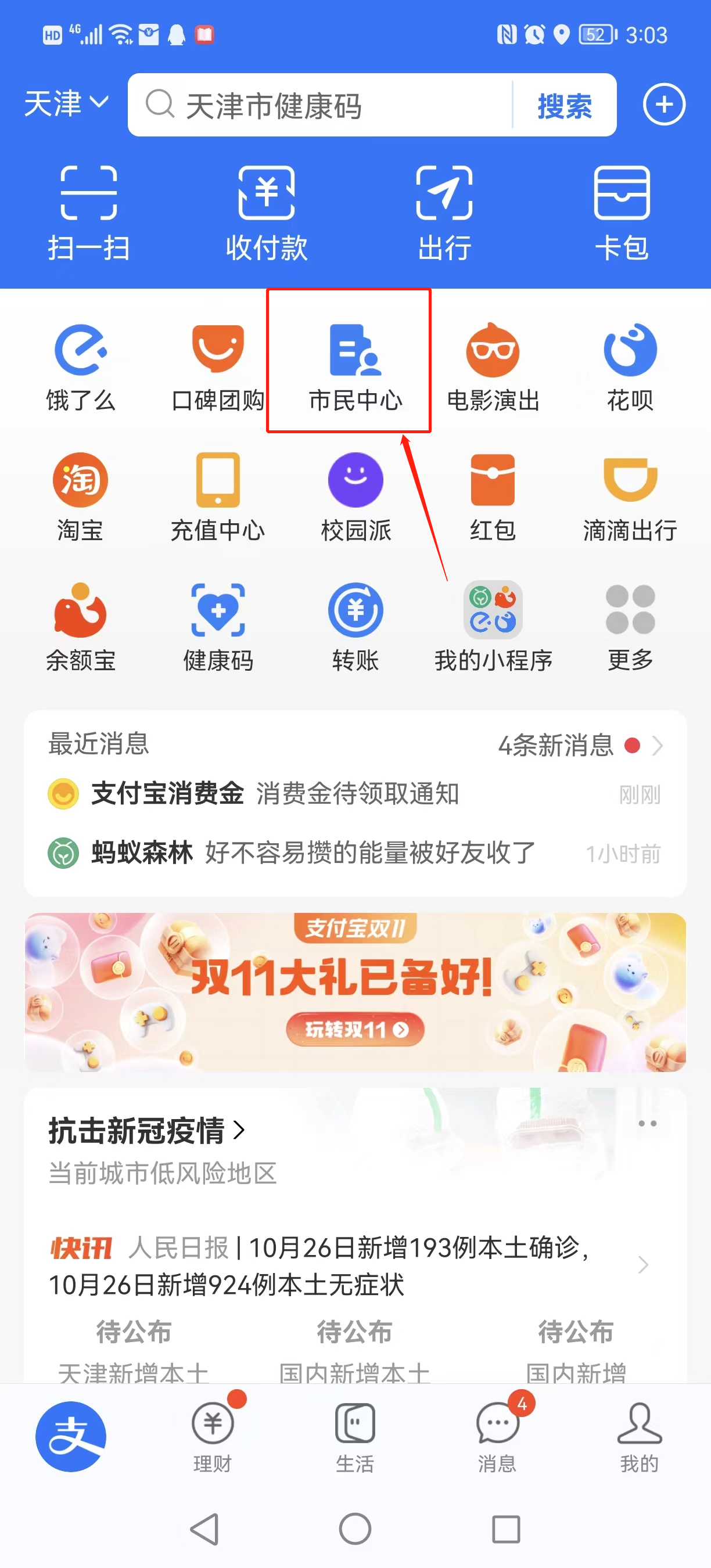 1、打开支付宝APP,找到“市民中心”;