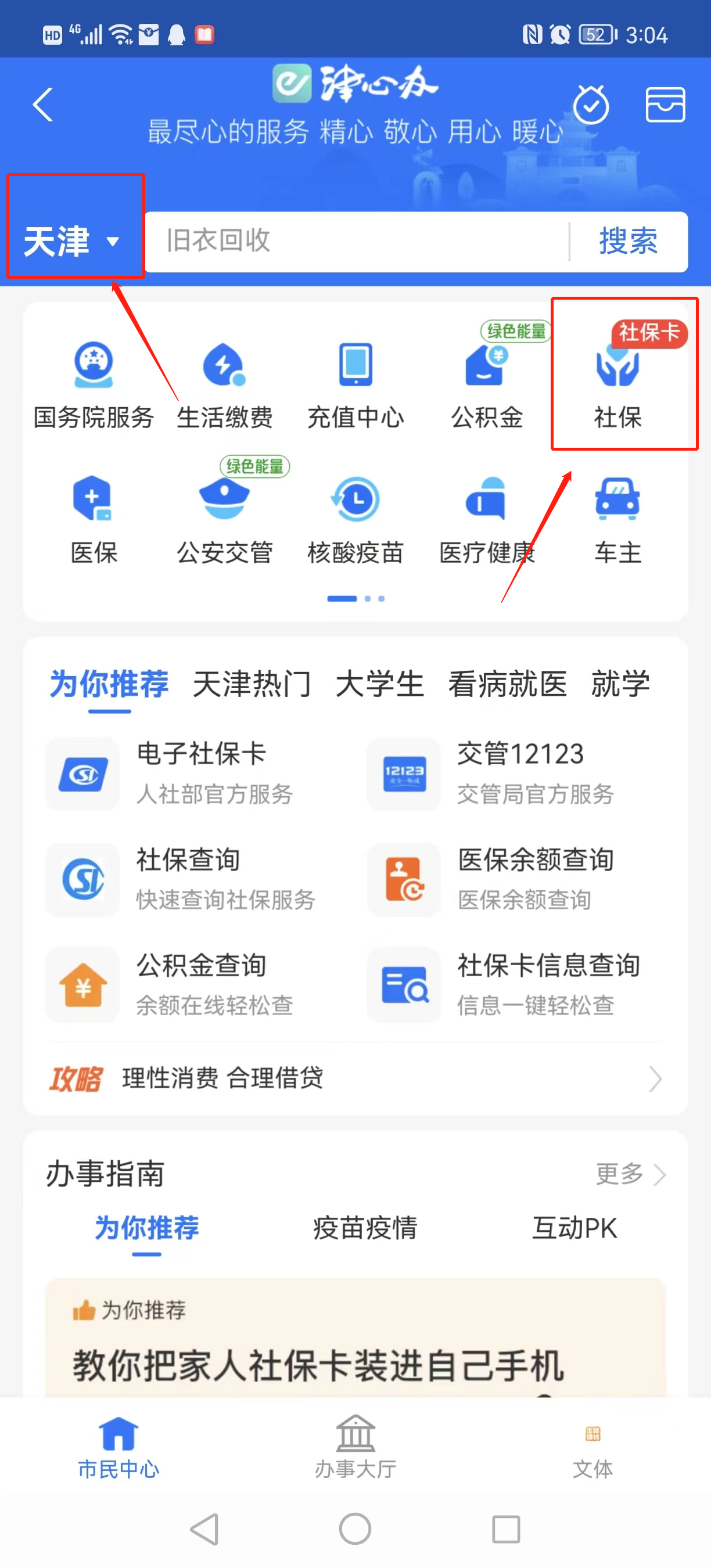2、点击进入后,城市选择天津后,点击“社保”;