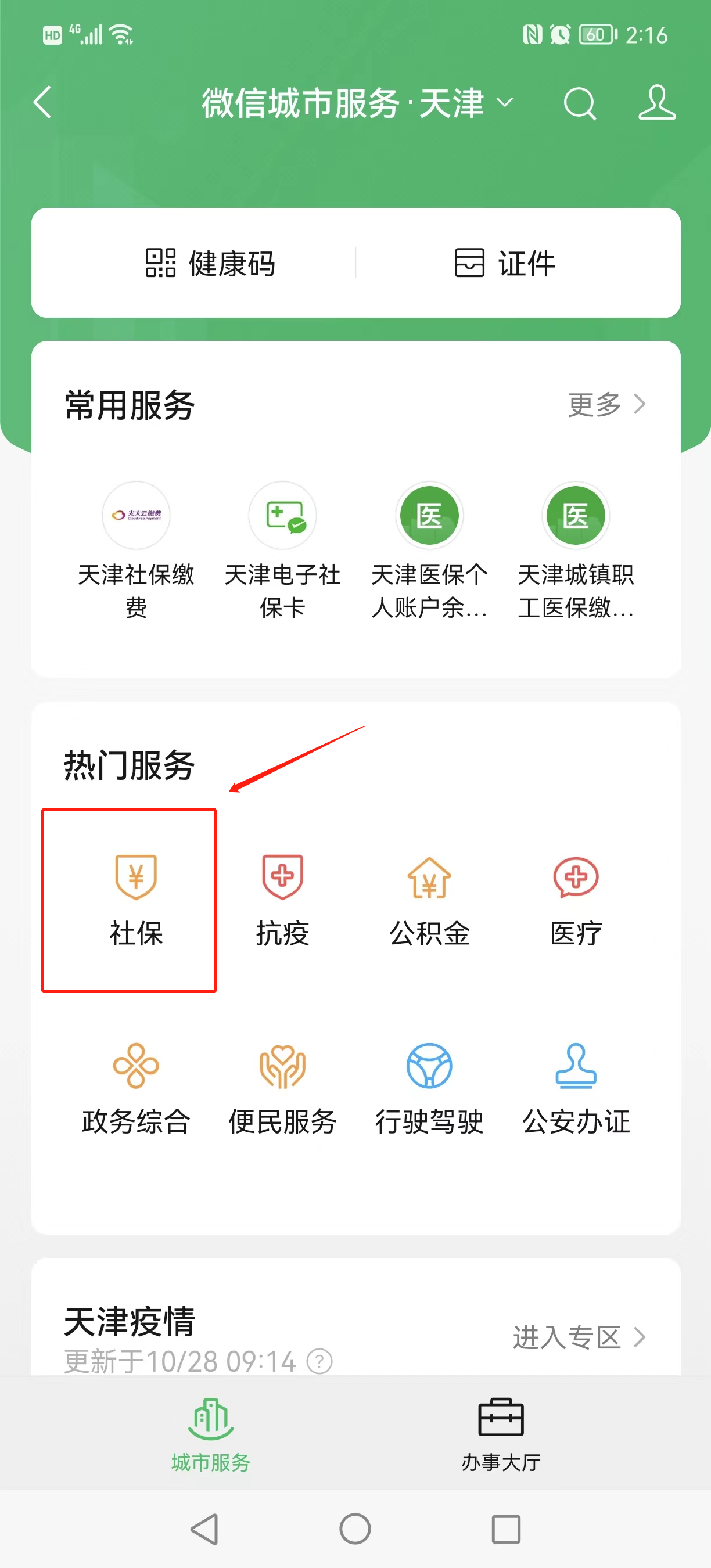 3、在“热门服务”栏目下找到“社保”;