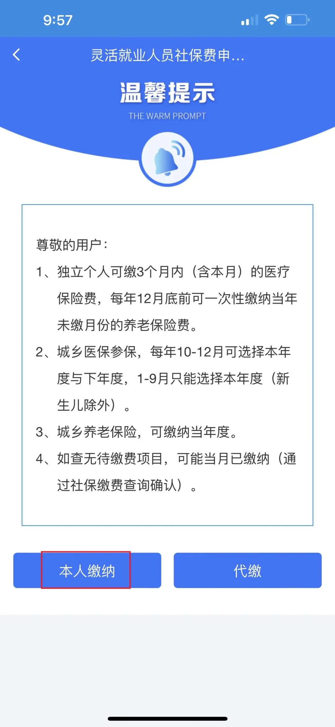 (3)点击“本人缴纳”或“代缴”;