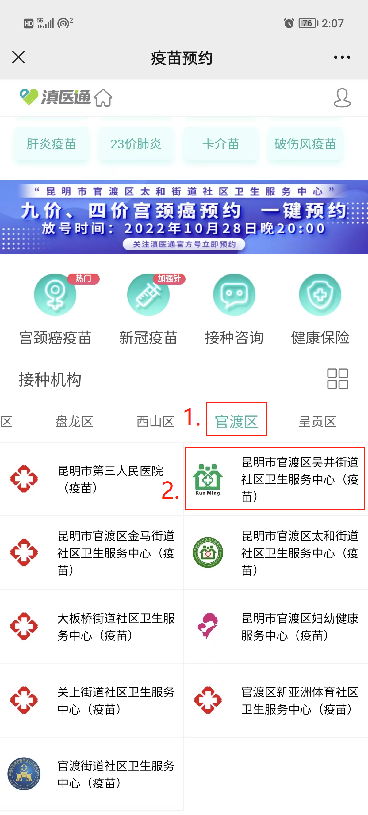 第三步:点击页面里点击找到【官渡区】,然后点击【官渡区吴井街道社区卫生服务中心(疫苗)】