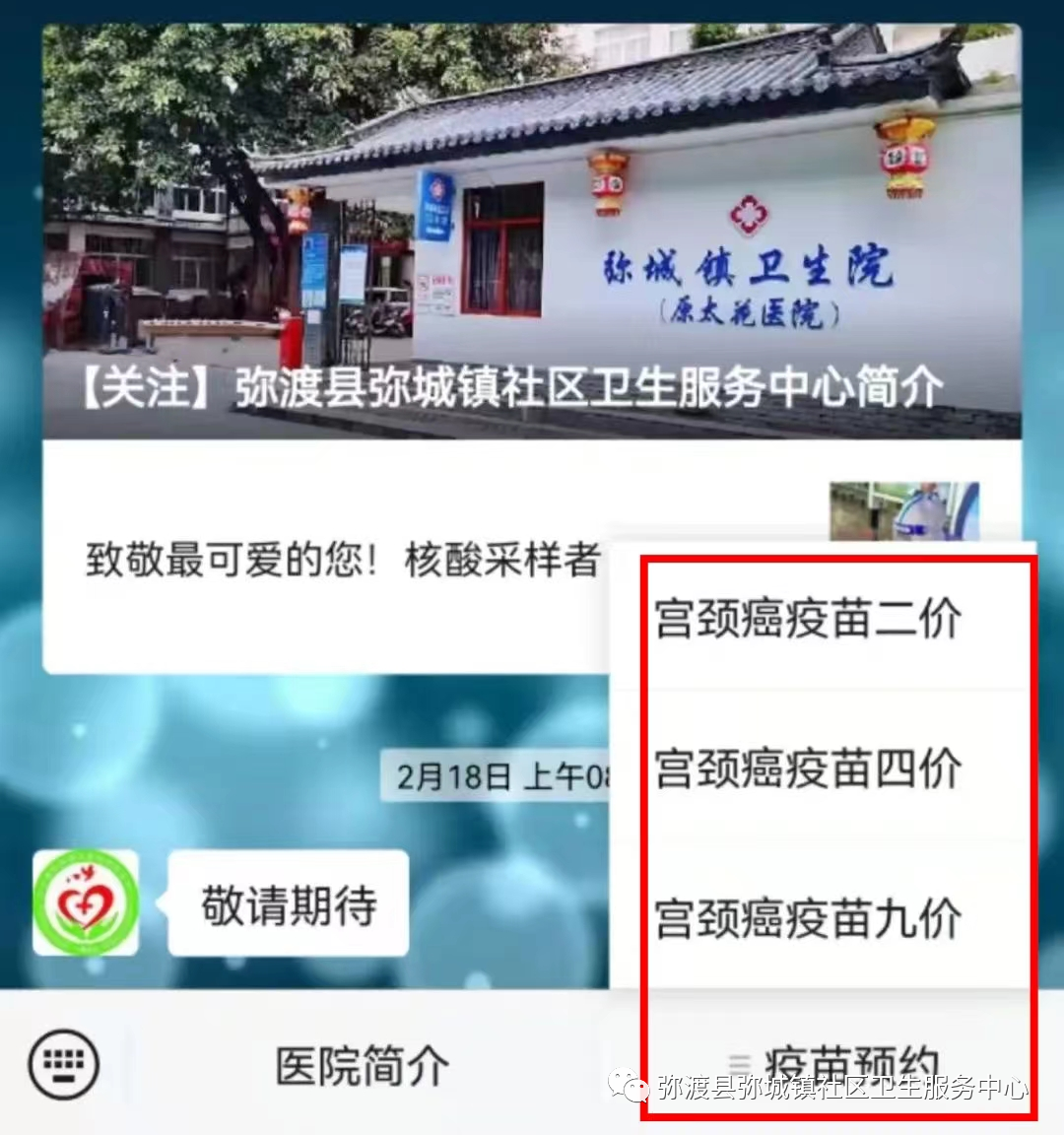 弥渡县弥城镇社区卫生服务中心宫颈癌疫苗预约全部实行网络预约,不接受电话和现场预约。可通过微信公众号【弥渡县弥城镇社区卫生服务中心】进行预约,约完即止。预约步骤如下: