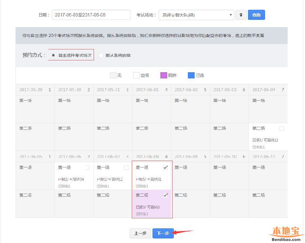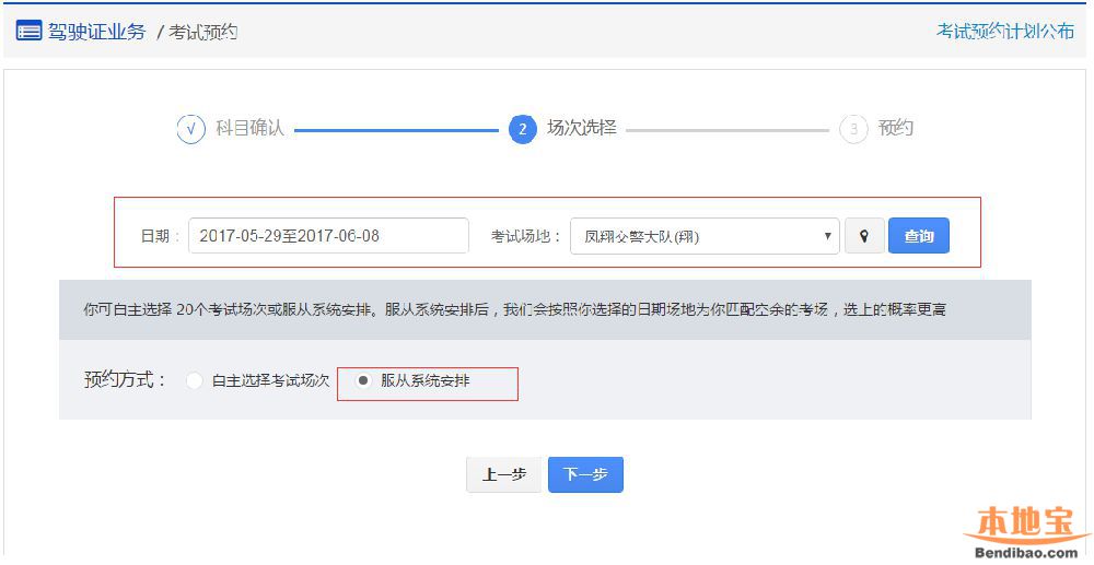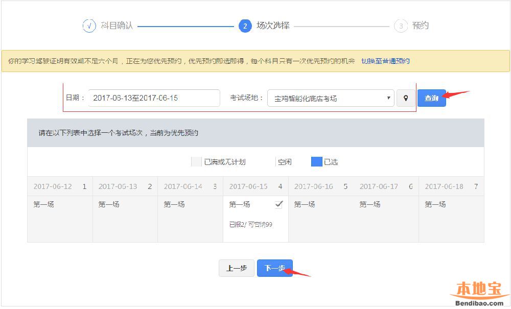 在该步骤,用户需选择考试日期和考试地点,点击【查询】,会显示对应的可预约的考试场次。