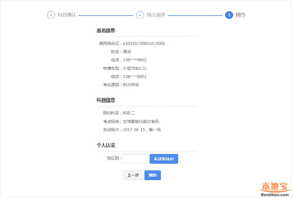 该步骤显示用户的预约信息,再次确认信息以后,点击【发送验证码】,系统会发送6位验证码到用户绑定的手机,用户输入手机验证码后,点击【预约】完成考试预约。