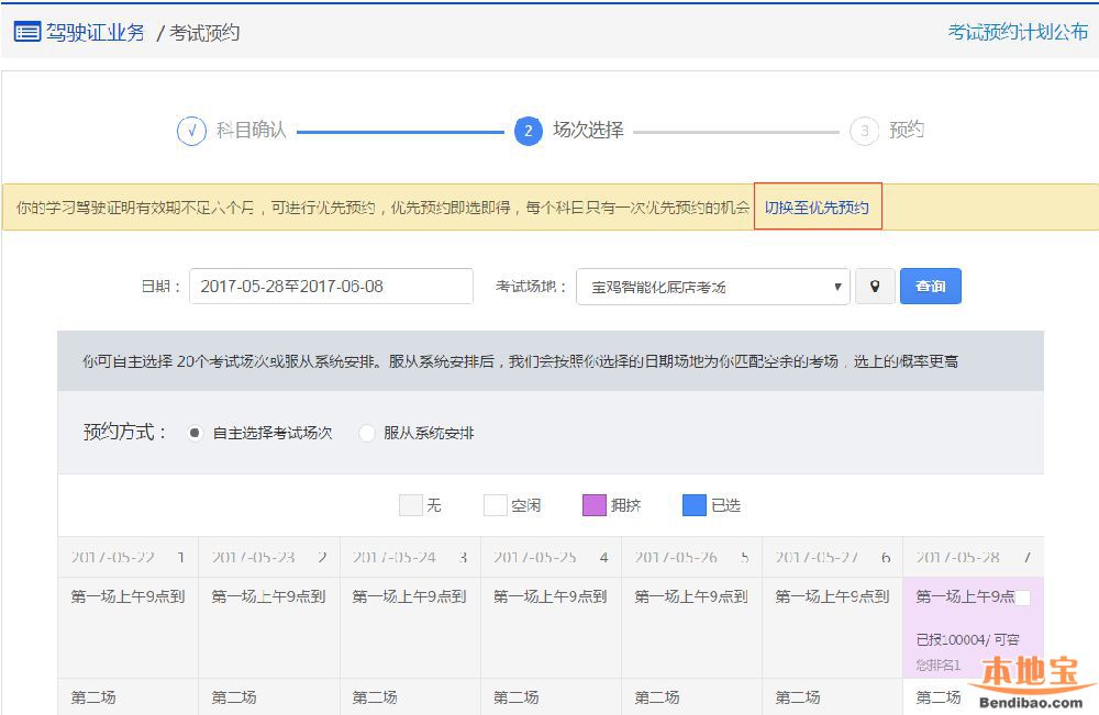 学员优先预约时,可以选择具有空余优先预约名额的考试场次进行预约。只要预约申请成功且学员不存在其他法规规定的不符合考试预约情形,就安排考试。