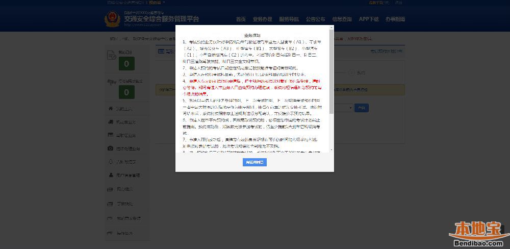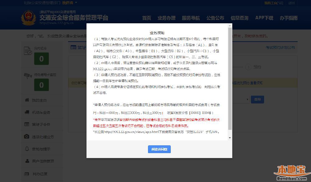 3、用户在互联网登录后,点击【驾驶证业务】→【考试预约】业务功能办理。办理业务用户类型:互联网注册的个人用户。