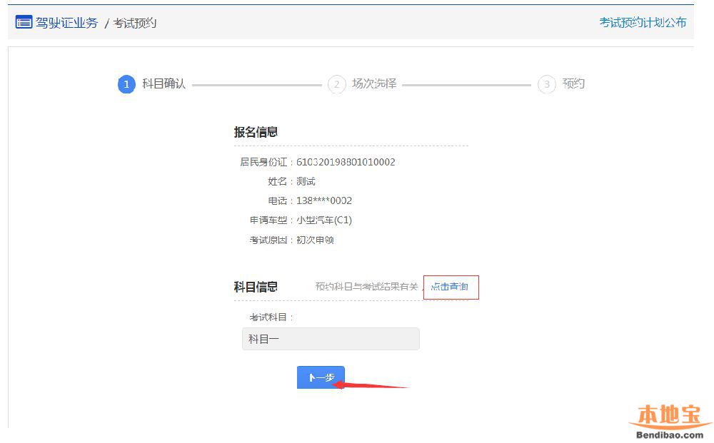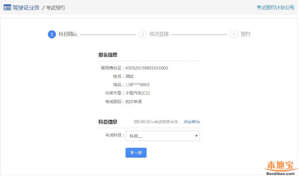 在该步骤,会显示用户的基本信息,用户需选择预约科目,点击【下一步】进入步骤2【业务须知】。