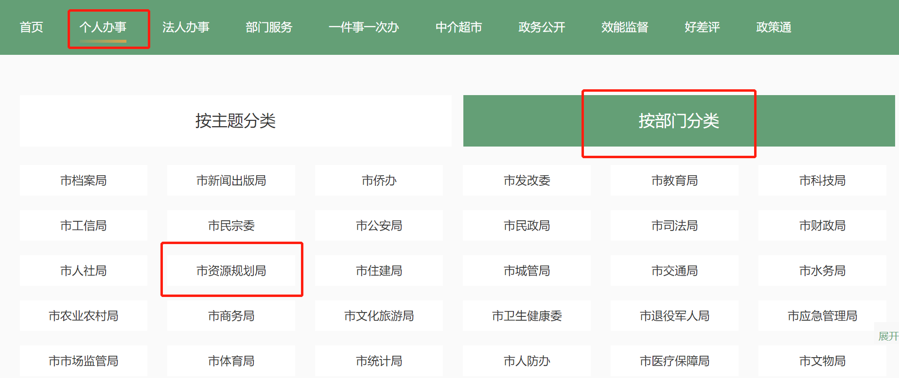 2、点击【个人办事】—【按部门分类】—【市资源规划局】