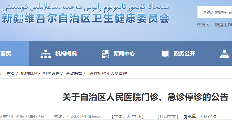 根据自治区疫情防控工作指挥部安排,自治区人民医院拟作为“红码”医院进行诊疗服务调整。为进一步做好“红码”医院改造准备工作,自2022年10月30日10时起,该医院门诊(含发热门诊)、急诊暂停诊疗服务。请广大患者前往其他“黄码”“绿码”医疗机构就诊。