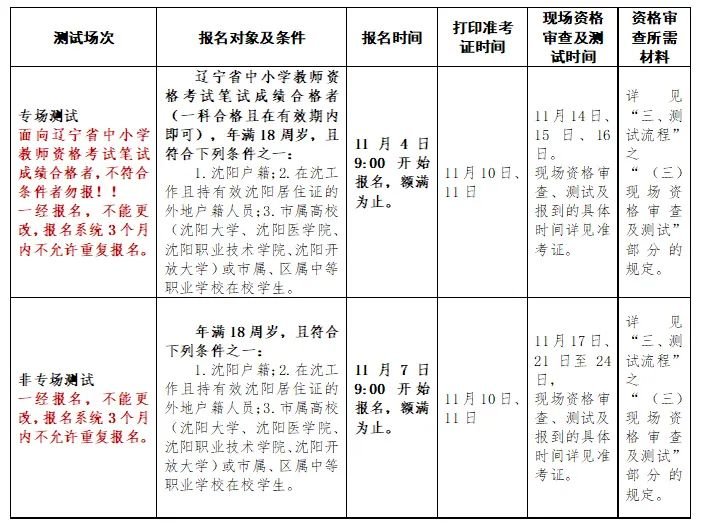 测试时间为11月14日至17日、11月21日至24日。其中,14日、15日、16日是面向辽宁省中小学教师资格考试笔试合格(一科合格且在有效期内即可)且符合相应条件人员的专场测试;其余5日面向其他符合相应条件的人员开放。