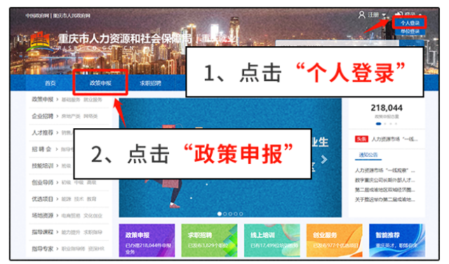 第一步:点击办理入口进入重庆就业网,进入后先登录,登录后点击“政策申报”——选择“脱贫人口求职创业补贴申领”,进入信息填写界面。