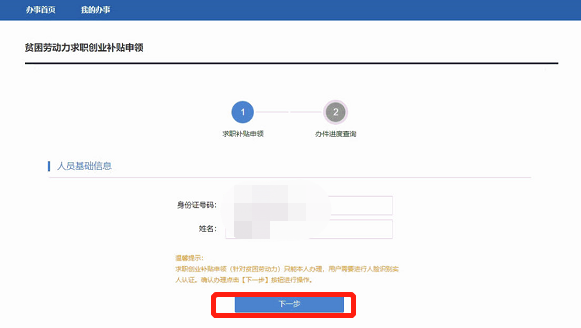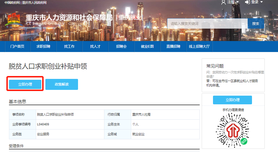 第二步:在页面点击立即办理按钮,然后在线填写贫困劳动力求职创业补贴申报信息。