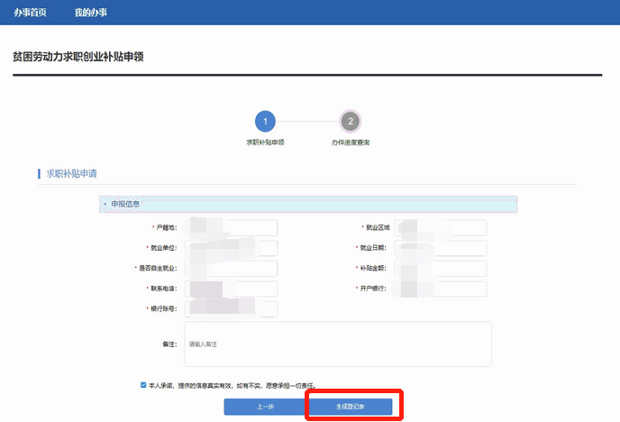 第二步:在页面点击立即办理按钮,然后在线填写贫困劳动力求职创业补贴申报信息。