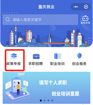 第一步:在首页点击“政策申报”进入“贫困劳动力求职创业补贴”在线办理页面。