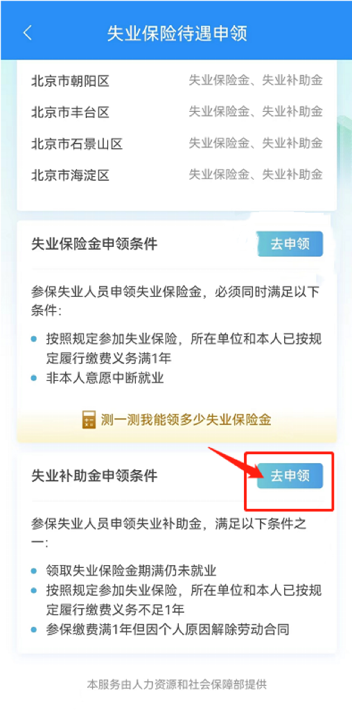 阅读失业补助金申领条件,点击“去申领”,阅读并填写相应信息进行申领(如下图):