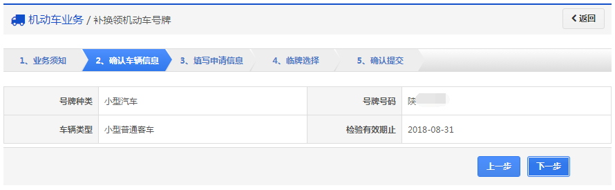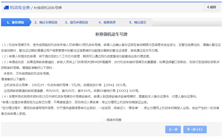 在该步骤,用户需认真阅读其内容,包括:办理补换领机动车号牌需要注意的各项内容和相关责任,如下图所示。同意的,勾选“阅读并同意”,点击【下一步】进入步骤2【确认信息】。