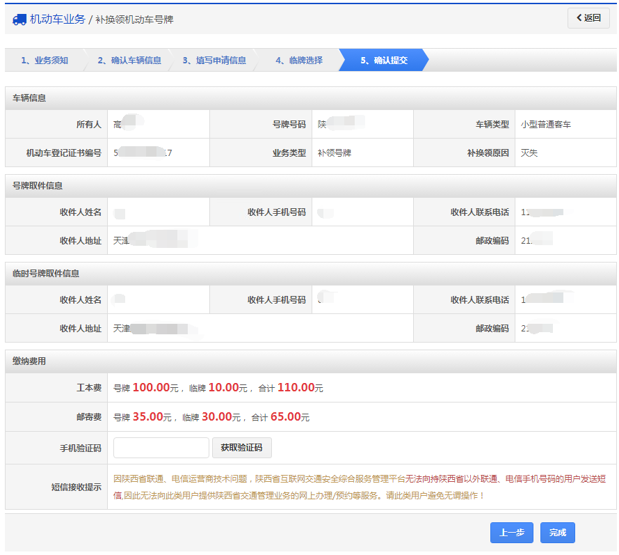 再次确认信息以后,点击【获取验证码】,系统会发送6位验证码到用户绑定的手机,用户输入手机验证码后,点击【完成】,进入步骤6【完成提交】。如果选择在线支付,提交后自动跳转至支付页面进行网上付款。