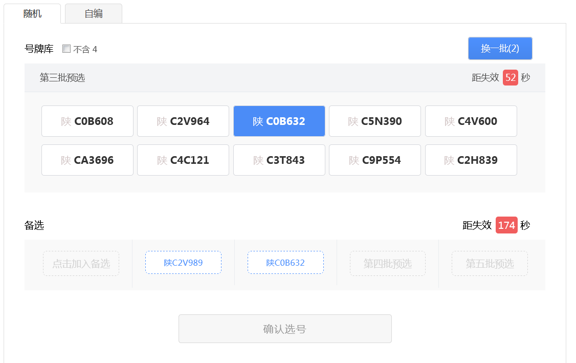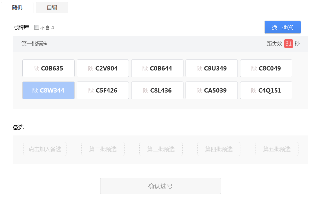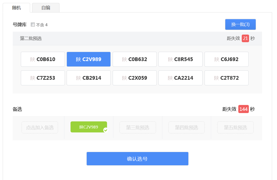 用户可以点击右上角“换一批”按钮重新进行随机(“换一批”后面的括号中的数字为用户当前选号车辆的剩余随机选号次数),此时会更新随机号牌栏中的号牌。 如果备选号牌栏中的有号牌并且没有失效,则备选栏中的倒计时将重新开始倒计时。 用户可以在新随机的号牌号码中选择一个号牌号码作为备选号牌,此时备选栏中的倒计时也将重新开始倒计时。如下图所示。 如此循环操作,用户每次随机选号,都可以从随机号牌中选择一个号牌号码作为备选号牌,直到随机选号次数用完。