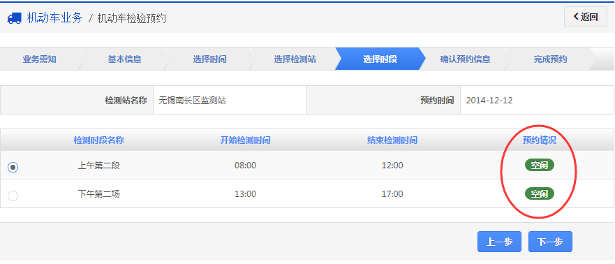在该步骤,系统会根据上两个步骤的选择计算选定检测站和日期下所有时段的预约情况,预约情况为“空闲”的可以选择,如下图所示。用户根据自己的时间安排,选定时段后,点击【下一步】钮进入步骤6【确认预选信息】。