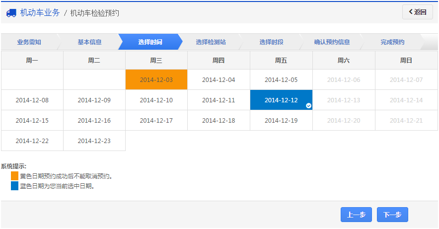 在该步骤,系统会显示当前可以预约的所有日期,用户可以根据自己的时间安排选择预约日期,如下图所示。需要注意是,以黄颜色显示的日期预约成功后是不能取消预约的。选定预约日期后,点击【下一步】按钮进入步骤4【选择检测站】。