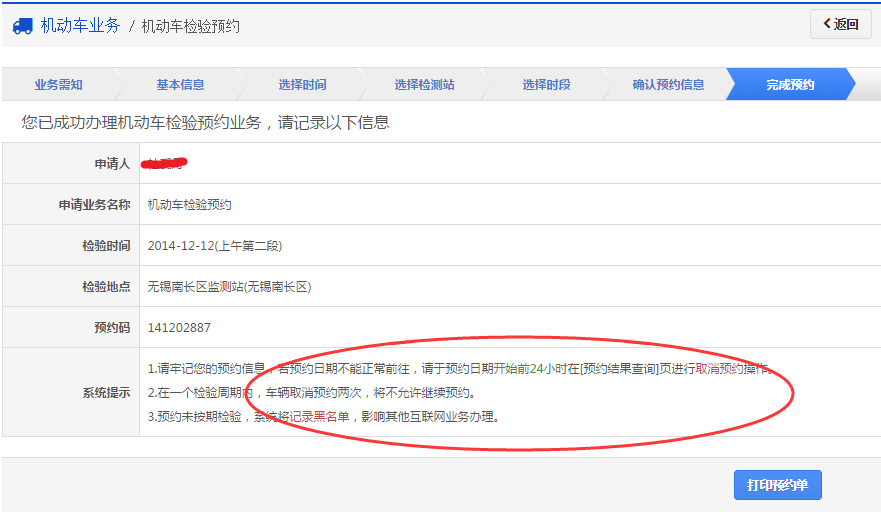 注:用户需要特别注意的下图中用红色椭圆标记的系统提示部分,其中包含了对取消预约的限制说明,预约未按期检验,用户将会被记入黑名单,影响其他互联网业务的办理。
