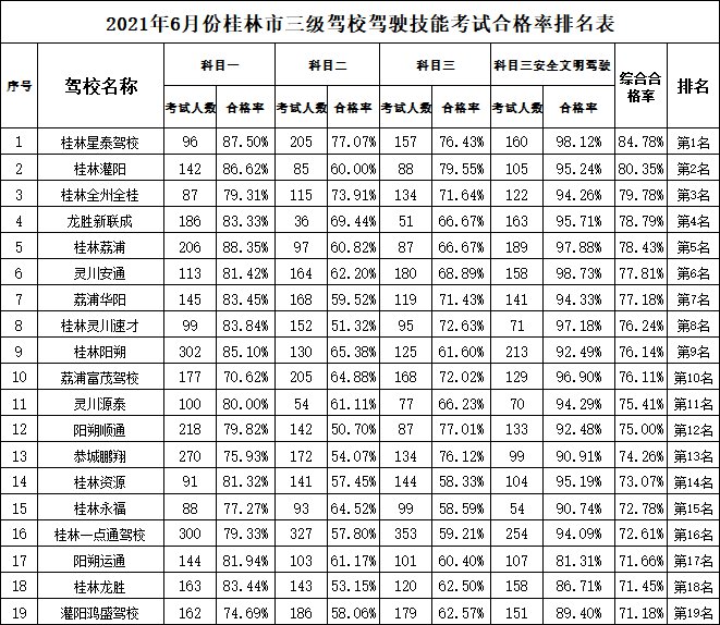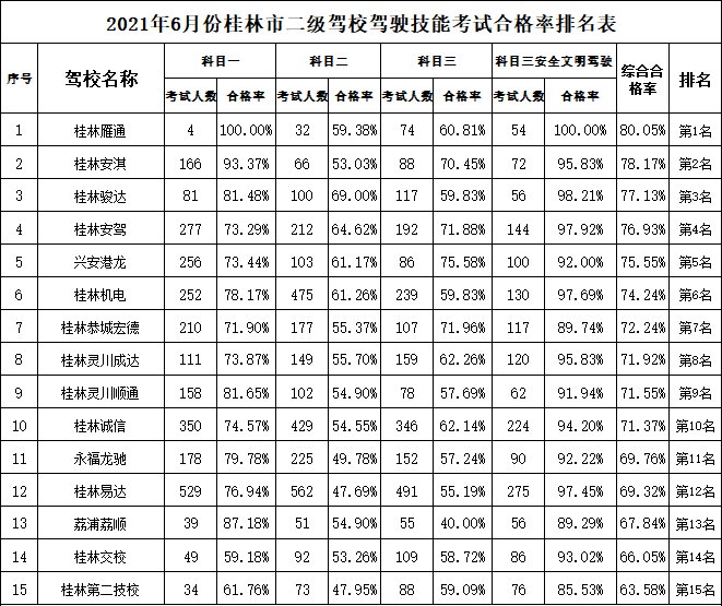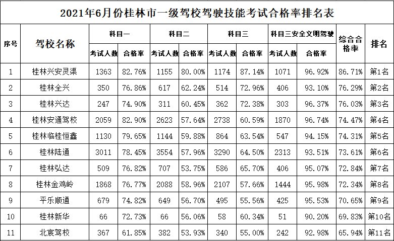 桂林交警于6月30日发布了2021年度6月份全市驾考考试合格率排名。