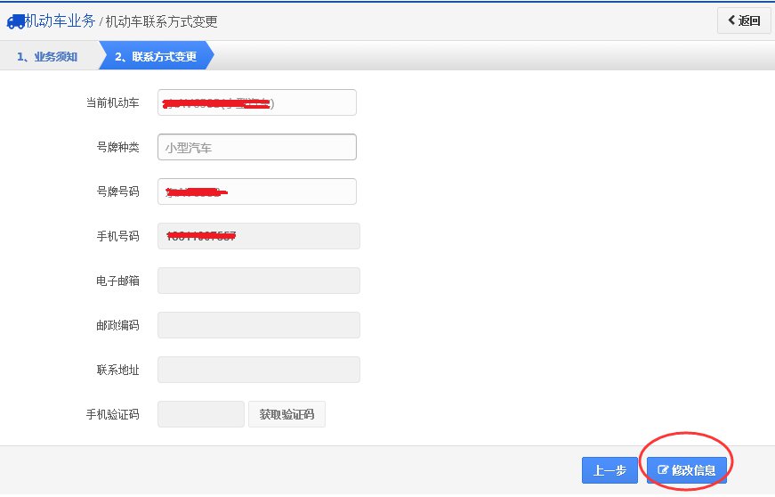 步骤2:【联系方式变更】返回在该步骤,显示用户当前需变更联系方式的机动车信息,用户要认真确认选择的车辆是否有误,如下图所示。