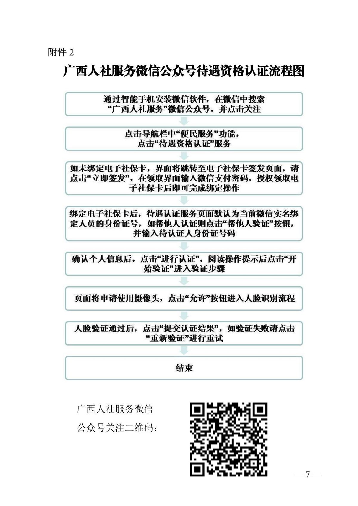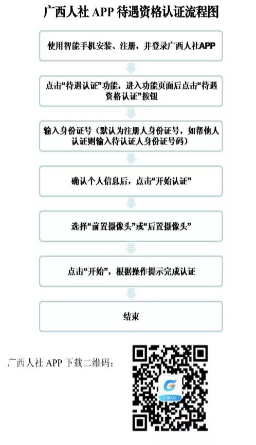 (二)“广西人社服务”微信公众号自助认证。搜索关注“广西人社服务”微信公众号,在导航栏点击“便民服务——待遇资格认证”,认证流程图详见附件2。