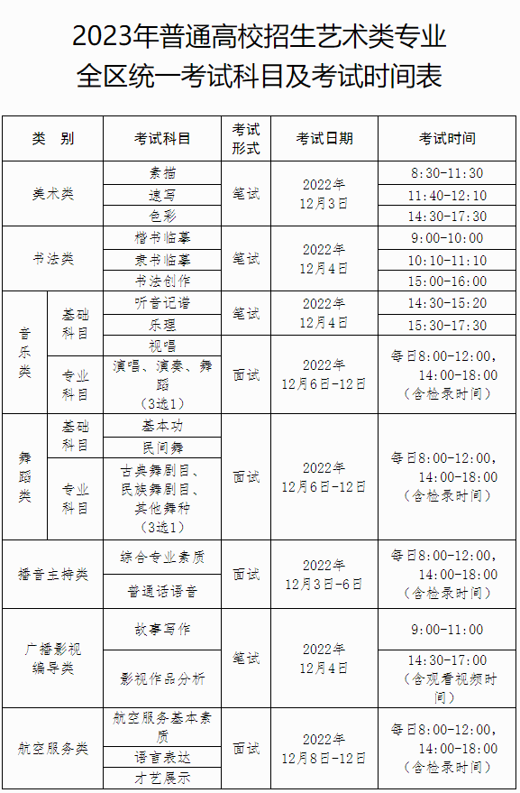 附件:2023年普通高校招生艺术类专业全区统一考试科目及考试时间表