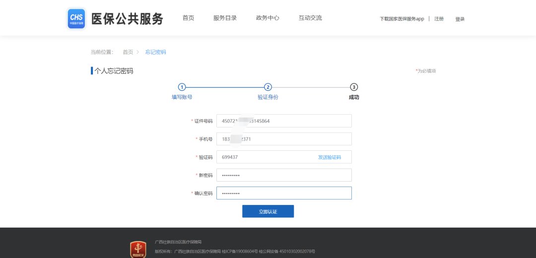 3、验证身份:输入证件号码、验证码、新密码、确认密码等信息。