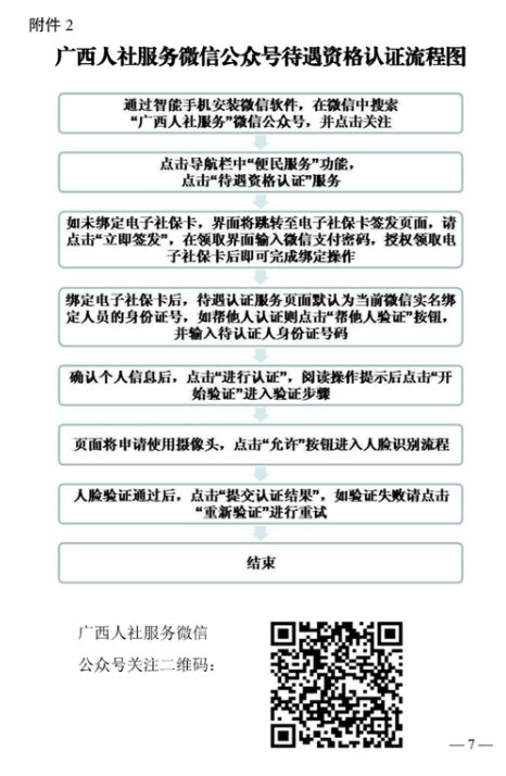 认证渠道:搜索关注“广西人社服务”微信公众号,在导航栏点击“便民服务——待遇资格认证”。