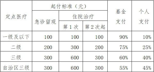 2.急诊留观和住院报销:参保人员因疾病在桂林市辖区内三、二、一级定点医疗机构急诊留观和住院,符合规定的医疗费用报销比例按以下标准执行。