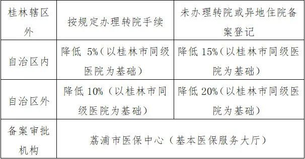 在大桂林辖区内住院的,无需办理转诊转院手续,在定点医院实行网络即时结报;因病需转往桂林市以外定点医院住院的,凭转出医院出具的转院证明及时办理转院手续;在桂林辖区外因急诊直接住院的,需在5个工作日内持所在医院入院(住院)记录到荔浦市医保中心办理异地住院备案登记手续。