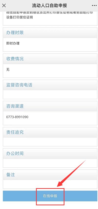 第六步:点击在线申报,微信自助申报后到辖区派出所打印居住证明或者到自助打印设备打印居住证明。