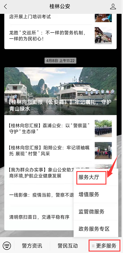 第一步:关注“桂林公安”微信公众号,点击菜单栏“更多服务”——“服务大厅”