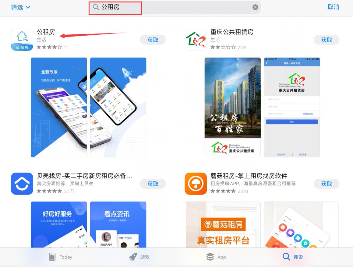 第一步:进入苹果APP商城,搜索“公租房”APP,点击下载。