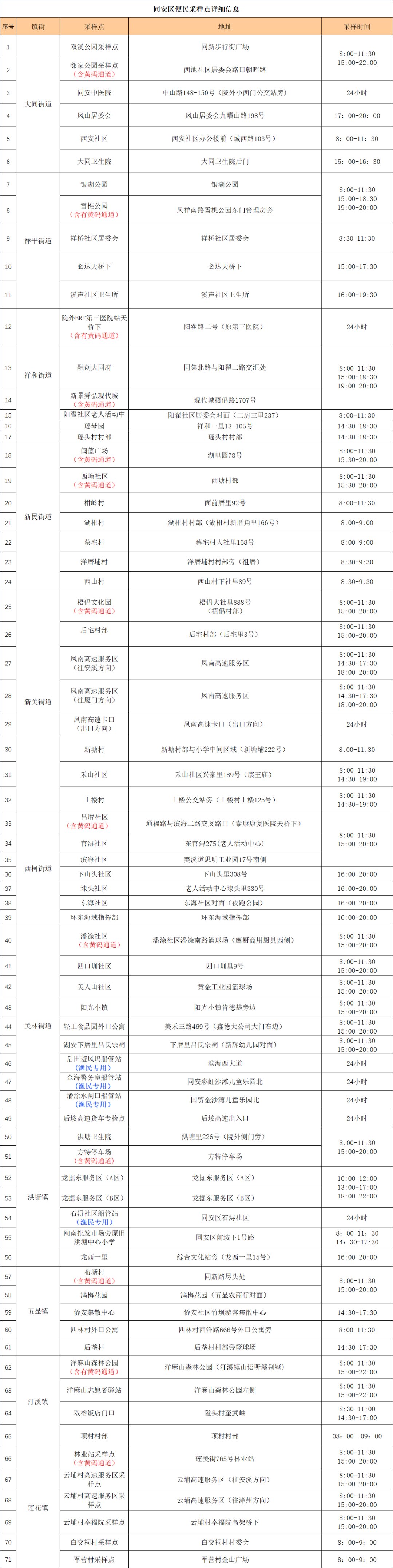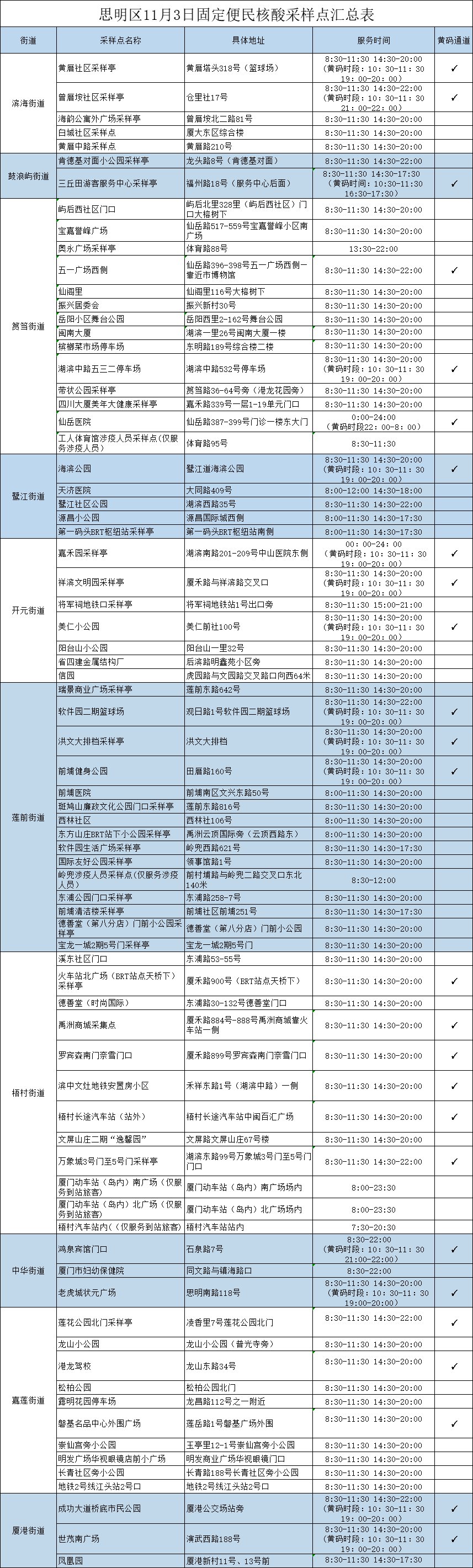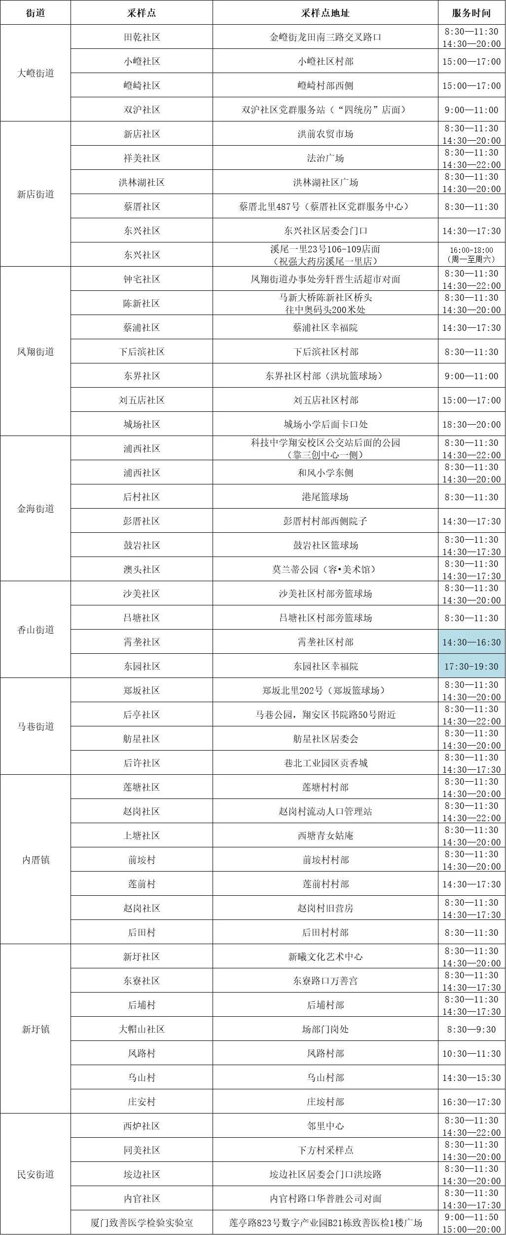 思明区(点击可看大图)采样时间为早上8:30-11:30,下午14:30-20:00。