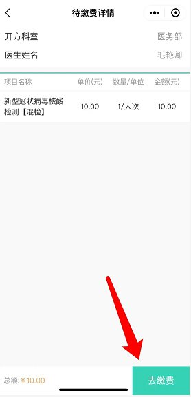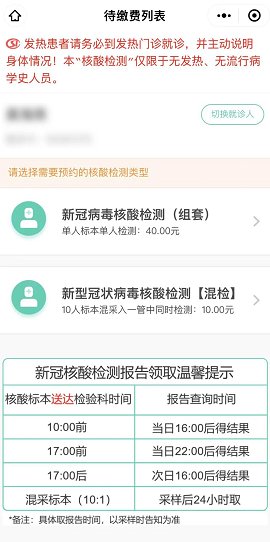 3、完成绑卡后,点击【核酸检测预约】→【我已知晓】→选择核酸检测类型【40元(单检)】或【10元(混检)】→点击已开具的核酸缴费项目→点击【去缴费】 →完成缴费。【温馨提示:保留该页面去核酸检测室采样即可】。