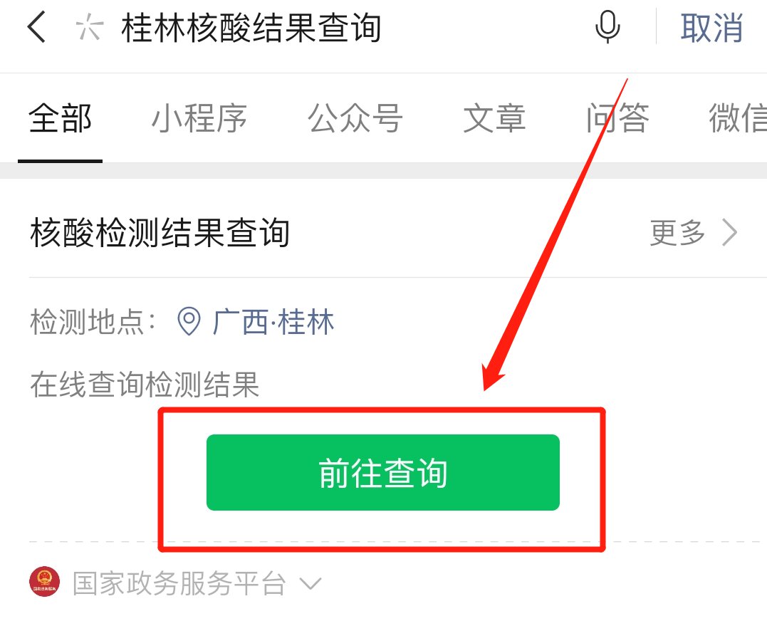 2.使用微信搜索“桂林核酸结果查询”,随后点击核酸检测结果查询服务中的“前往查询”(如下图所示);