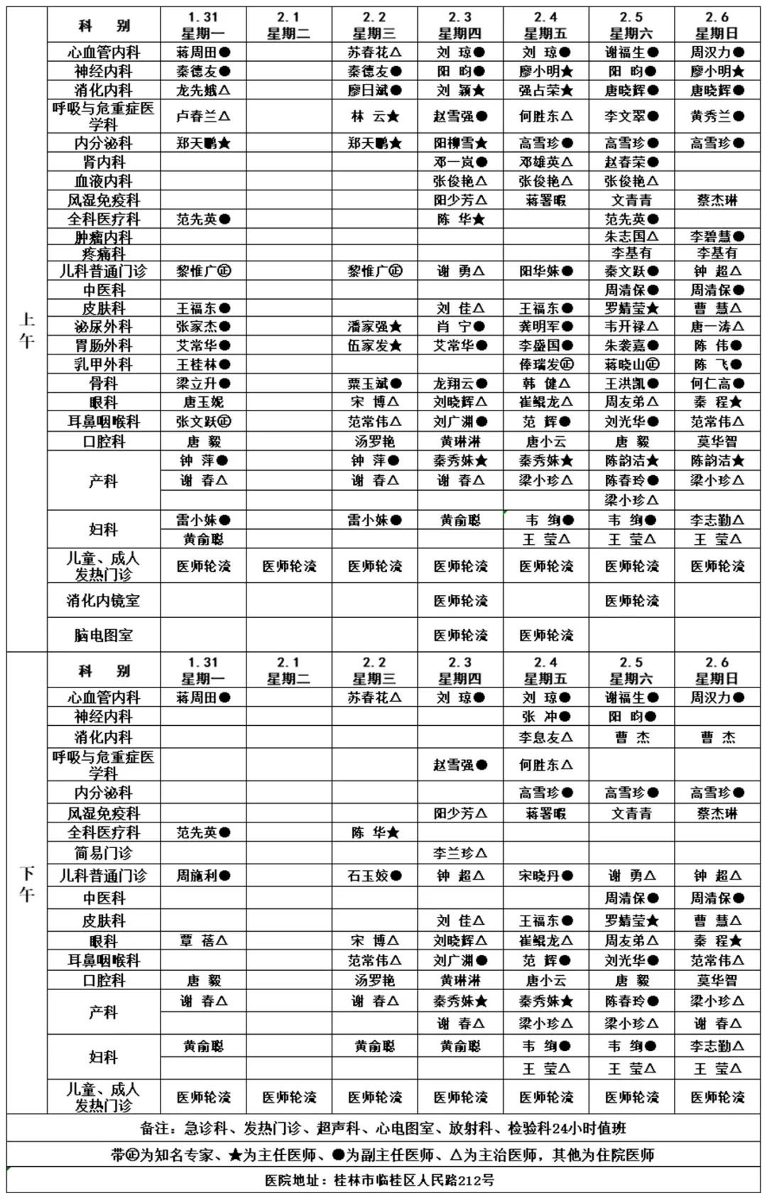 桂林医学院第二附属医院2022年春节假期门诊排班表